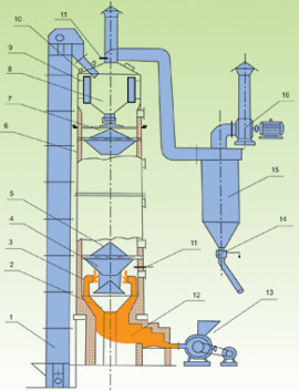 1、提升機 2、下料漏斗 3、導熱管 4、滑料盆 5、散料錐 6、耐熱保溫層 7、截流裝置 8、料倉 9、預熱管道 10、智能料粒儀 11、預熱儀 12、熱風爐 13、噴煤機 14、料閥 15、收塵器 16、風機。