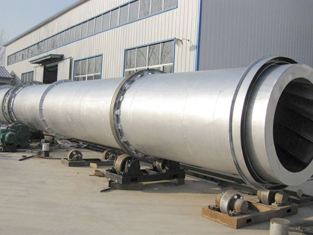雙筒烘干機由沸騰爐燃燒產生的熱煙氣,通過混合室的調整,溫度達800~850℃狀態下進入烘干機,喂料系統將小于30毫米的物料喂入烘干機的預熱帶,經進料螺旋、螺旋狀的角形揚料板和萬字形揚料組合作用下物料被推進、拋撒、預熱、逐步進入烘干帶。